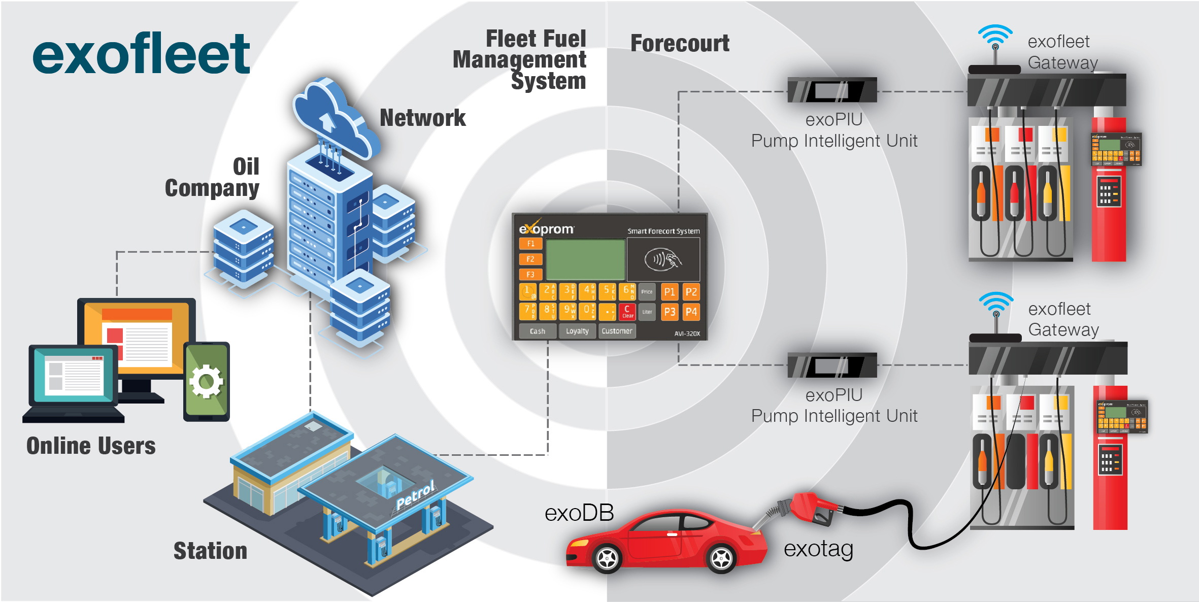 Exofleet bireysel ve ticari istasyonları için modüler ve tamamen ölçeklenebilir uçtan uca RFID araç tanımlama otomasyon çözümüdür. Exofleet, birden fazla güvenlik seçeneğini kullanarak, pompa görevlisi veya sürücü yetkisi de dahil olmak üzere, her bir aracı tek tek kontrol ederek tüm yönleri ile filoları güvenle yönetir.